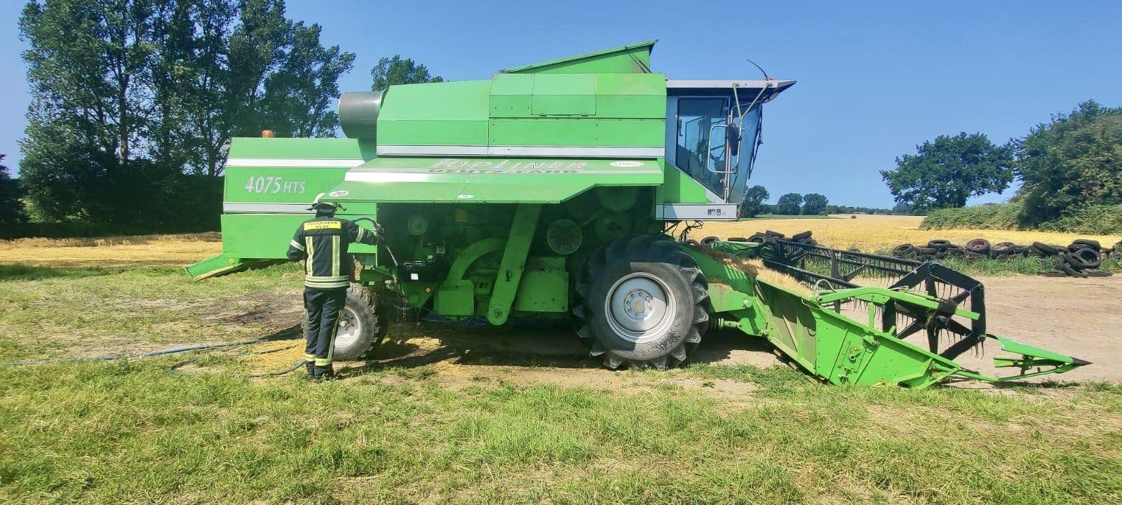 Während der Erntezeit freuen sich die Landwirte, wenn es über einen längeren Zeitpunkt warm und trocken ist, so dass die Ernte trocken eingeholt werden kann. Doch wenn es zu heiß ist und die Maschinen fast Tag und Nacht laufen besteht die Gefahr das durch die hohen Temperaturen die Maschinen im wahrsten Sinne des Wortes auch mal heiß laufen. Am 17.07. wurde die Feuerwehr Rüde genau zu solch einem Einsatz gerufen. Gegen 14:44 Uhr bemerkte ein Mähdrescherfahrer eine Rauchentwicklung aus seinem Arbeitsgerät. Nachdem er die Feuerwehr über den Notruf 112 alarmierte, begann er mit seinem Feuerlöscher den Entstehungsbrand in Motorraum des Dreschers zu löschen. Bereits acht Minuten nach der Alarmierung waren die Einsatzkräfte der Feuerwehr Rüde vor Ort und konnten die Löscharbeiten beenden. Durch das schnelle Eingreifen konnte größerer Schaden verhindert werden und das Einbringen der Ernte konnte weitergehen.
